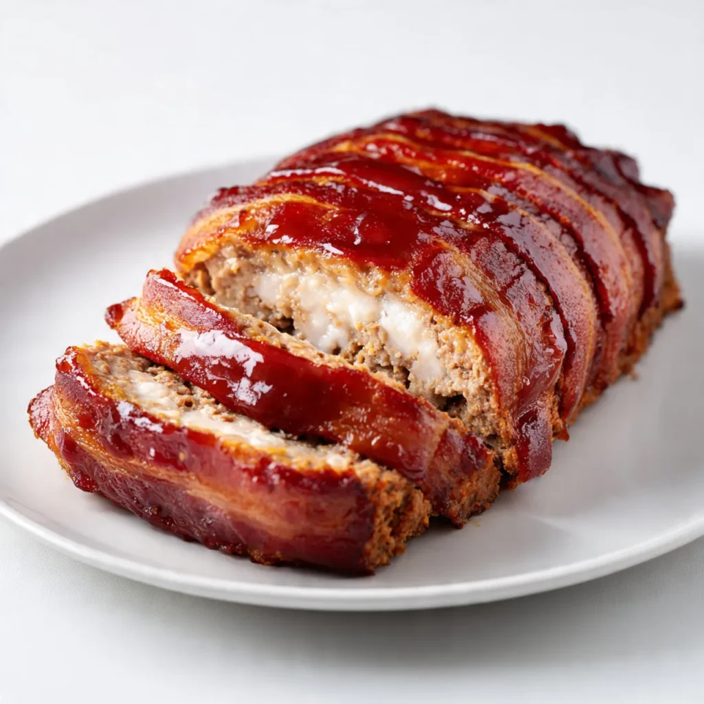 Bake 50–60 minutes until meatloaf reaches 160°F (71°C). Let rest 10 minutes before slicing. Bacon should be crisp and golden, locking in juicy meatloaf flavor.