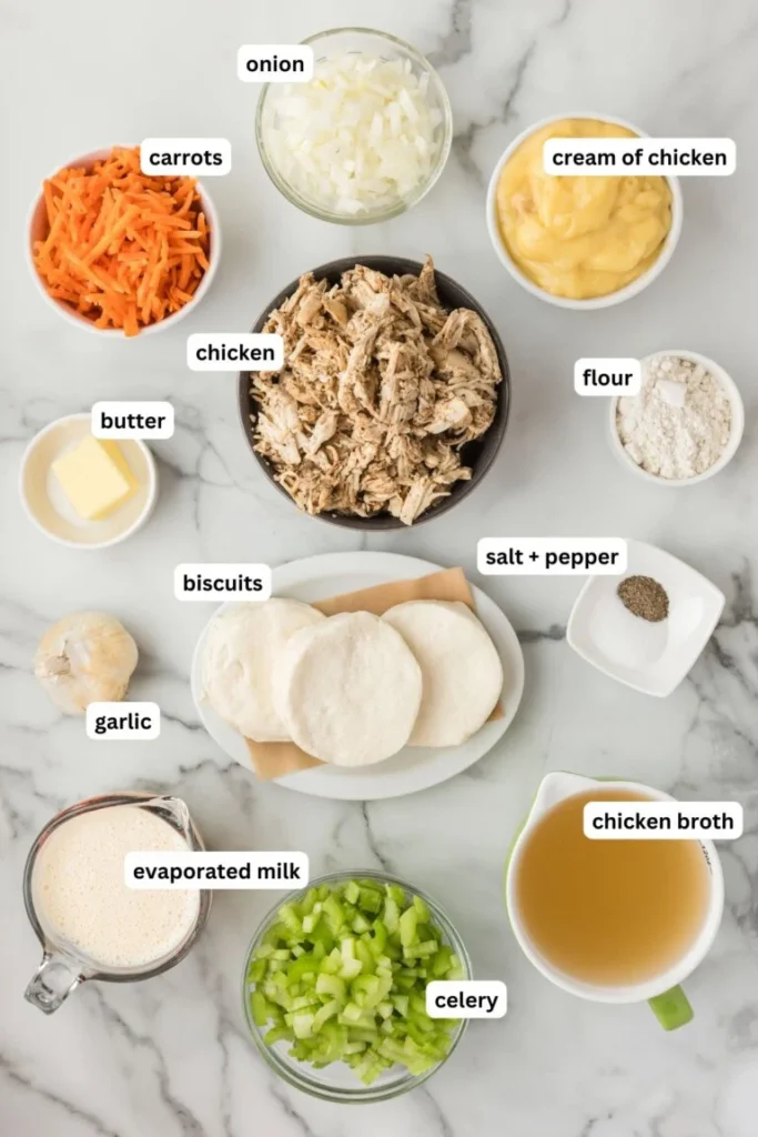 Dice the onion, slice the carrots, and chop the celery into small pieces. Mince the garlic and shred the cooked chicken. Cut each biscuit into quarters so they cook evenly when added to the pot later.