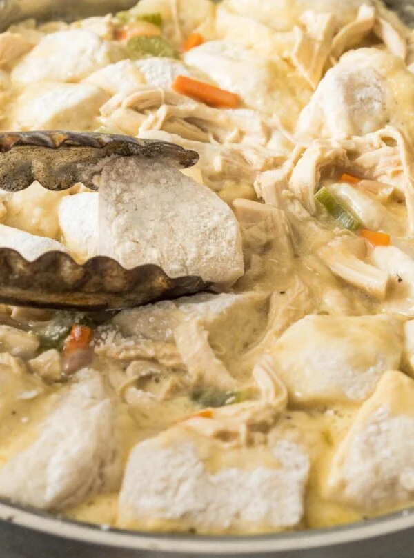 Drop biscuit pieces into the simmering mixture, spacing them out. Cover and cook for about 10–15 minutes until the dumplings are puffed and cooked through. The sauce should be thick, creamy, and gently bubbling.