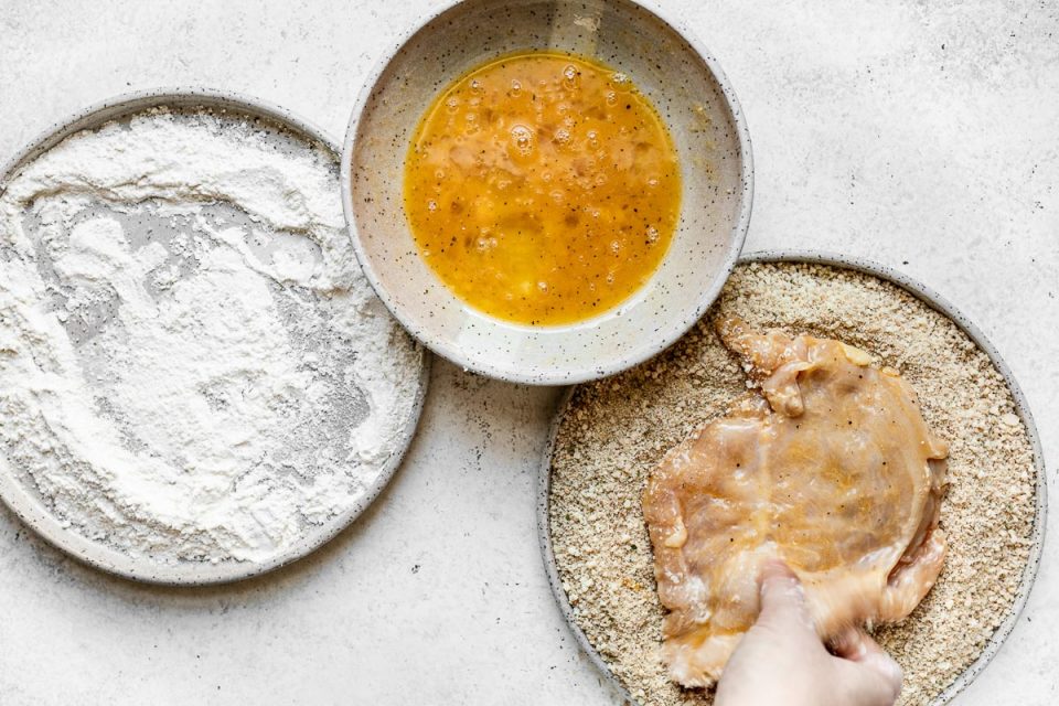 - Coat chicken in flour, egg, then Parmesan mixture.
