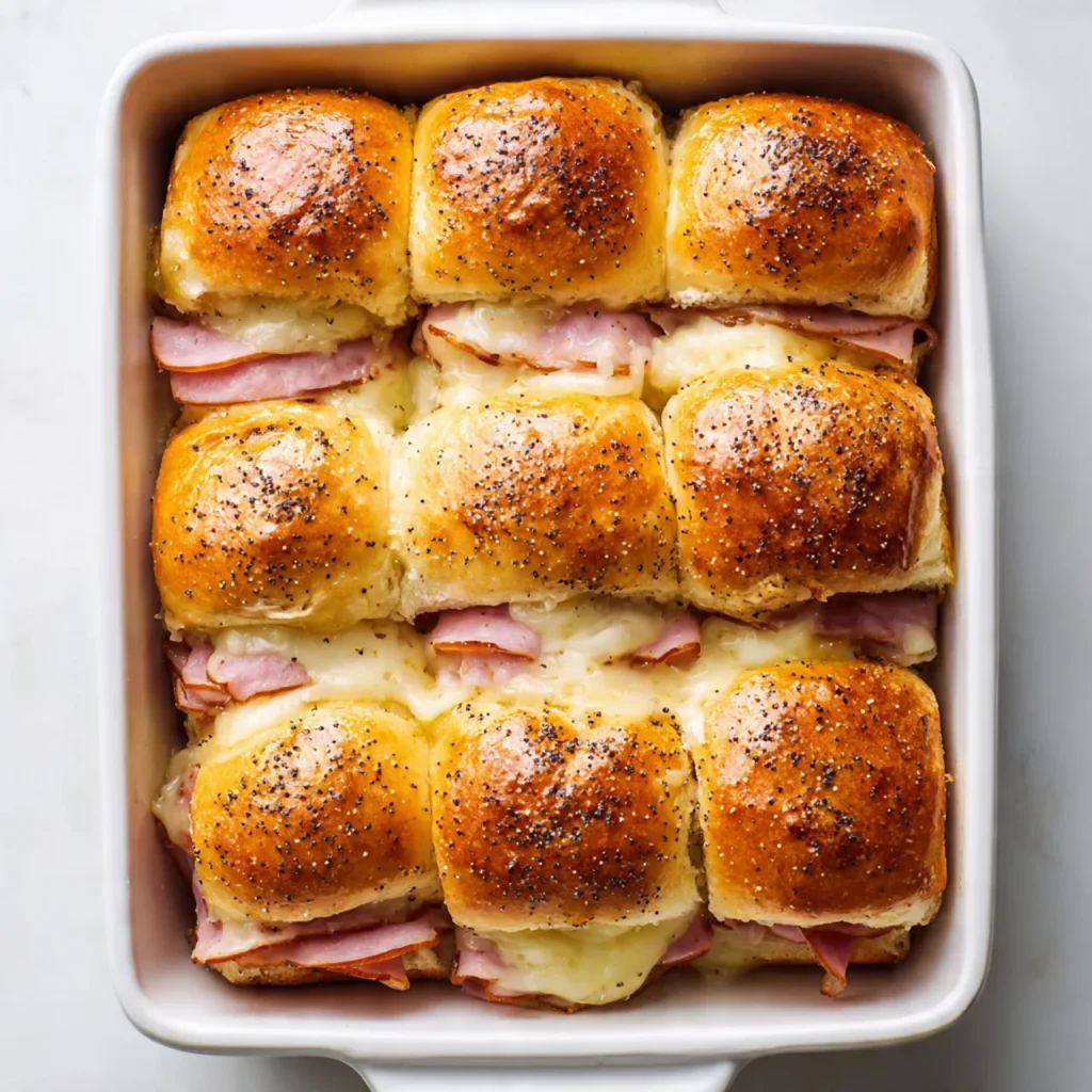 Soft slider rolls layered with savory ham and melted Swiss cheese, topped with a buttery glaze. Quick, cozy, and perfect for family dinners or casual gatherings.