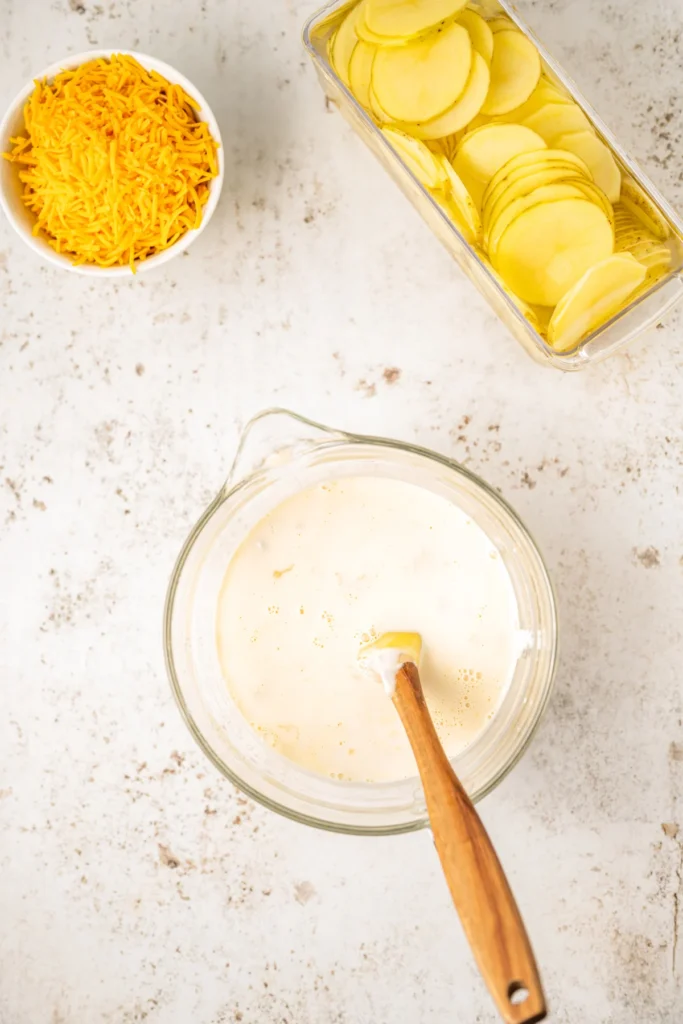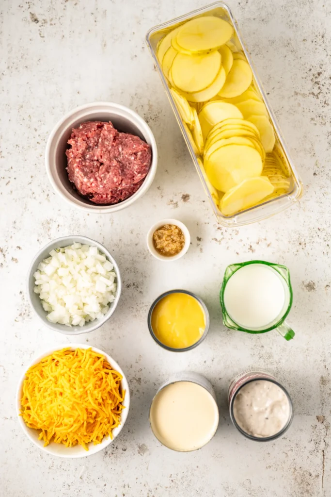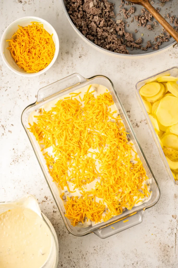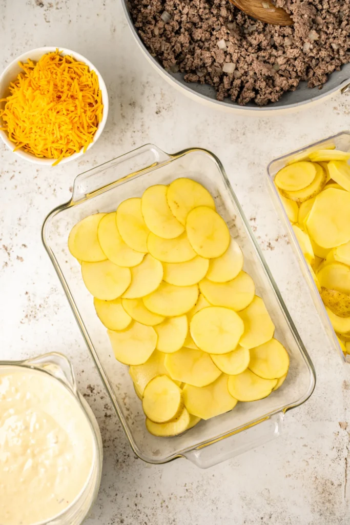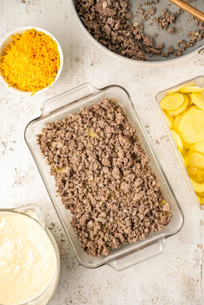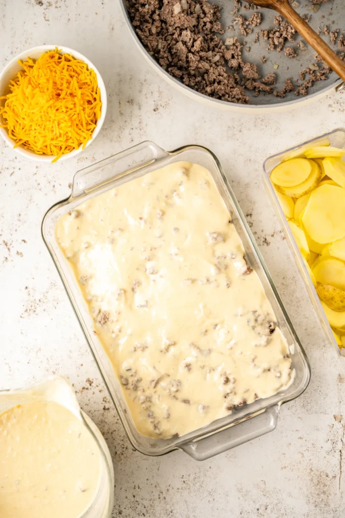 Layer the sliced potatoes in the baking dish, followed by the cooked beef mixture. In a bowl, mix cream of mushroom soup with milk until smooth, then pour it evenly over the layers so everything is coated and ready to bake.