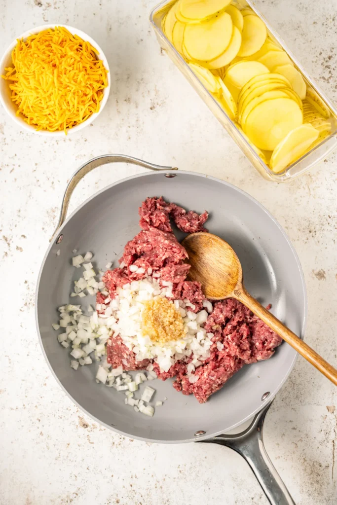 In a skillet over medium heat, cook the ground beef with chopped onion until browned and no longer pink. Stir occasionally until the mixture looks crumbly and fragrant, then drain any excess grease to keep the casserole from becoming too heavy.