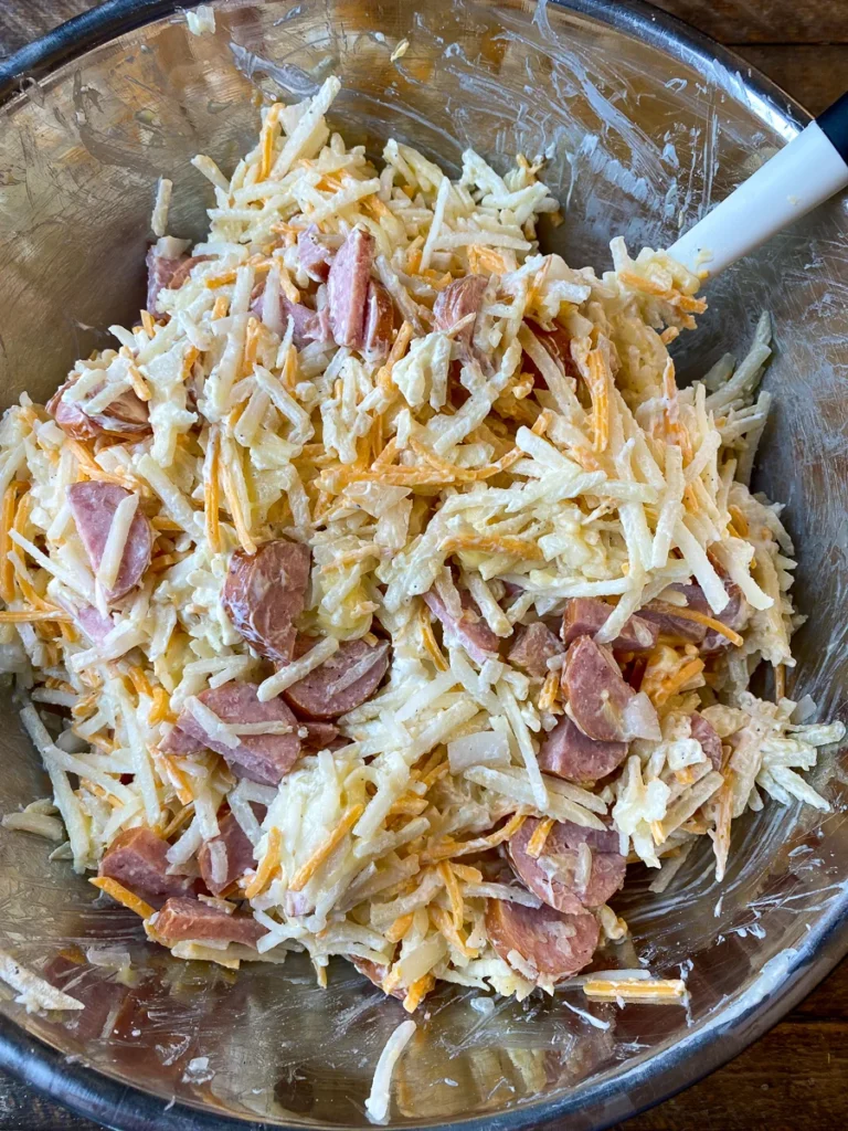 Transfer the mixture into the prepared baking dish and spread evenly. Sprinkle shredded cheese over the top. Bake until the potatoes are tender and the cheese is melted, bubbly, and slightly golden on the surface.