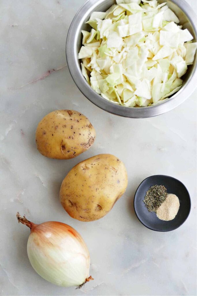 Peel and dice the potatoes into small, even pieces so they cook evenly. Chop the cabbage into thin strips and slice the onion. Keep all ingredients ready near the stove since the cooking process moves quickly once started.