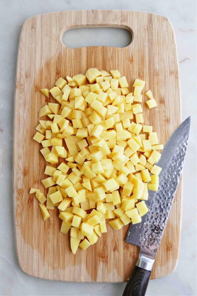 - Cut potatoes into even pieces so they cook at the same speed and don’t stay underdone