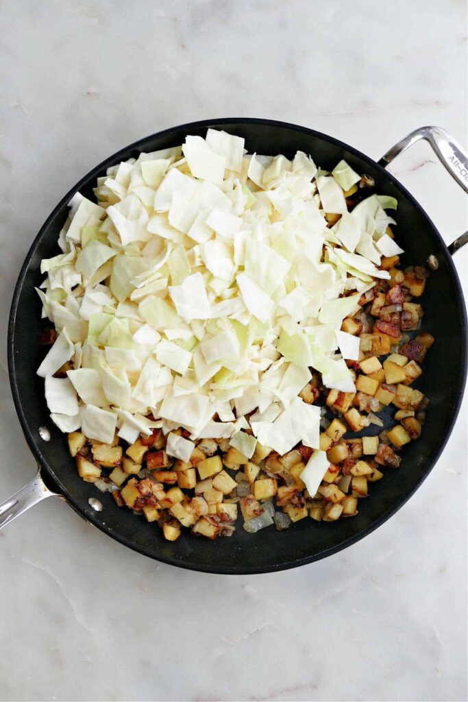 Add the sliced onion and cook until it turns soft and slightly translucent. Stir in the garlic, then add the cabbage. Toss everything together so the cabbage starts to wilt and mix with the potatoes.