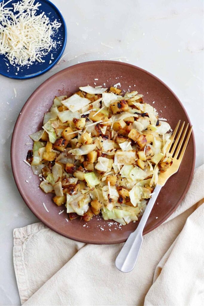 Each serving contains around 200–300 calories depending on portion size and cooking fat used. Protein is low, around 3–5g, while it provides fiber from cabbage and carbohydrates from potatoes. Values are estimates and may vary.