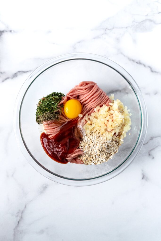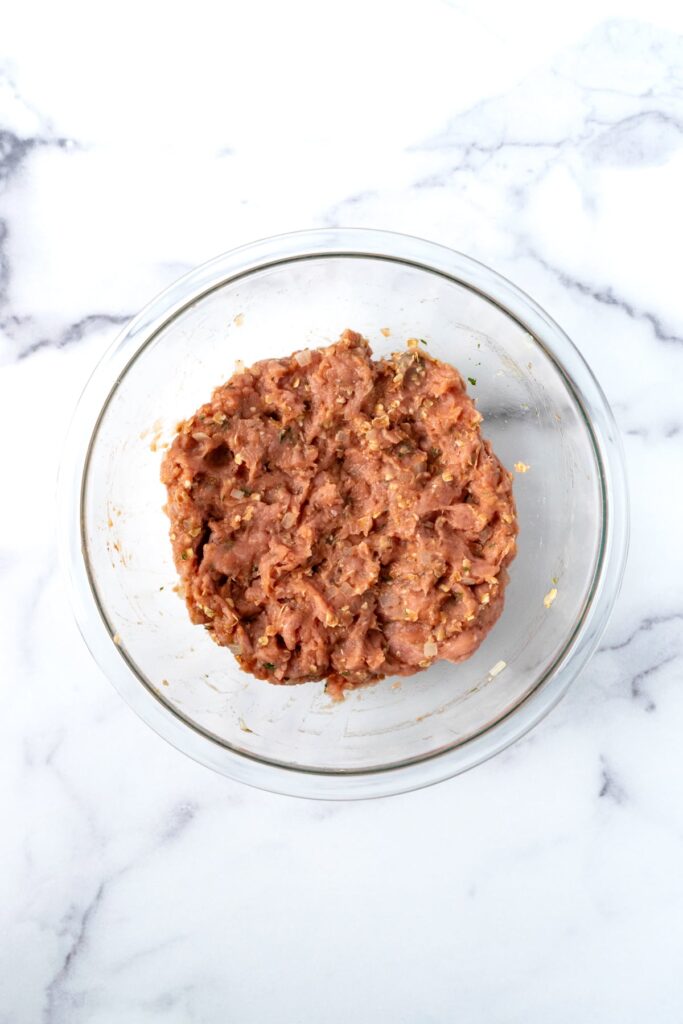 Add the ground turkey to the bowl with the breadcrumbs, Parmesan, milk, egg, onion, garlic, Italian seasoning, salt, and pepper. Mix everything gently with your hands or a spoon until fully combined, being careful not to overwork the meat.
