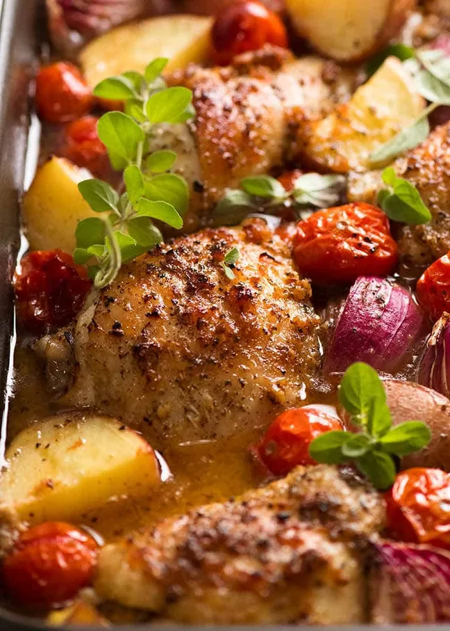 Preheat your oven and lightly grease a baking dish. Pat the chicken dry so the skin crisps nicely. Slice all vegetables into even pieces and keep everything ready nearby for quick assembly before cooking begins.
