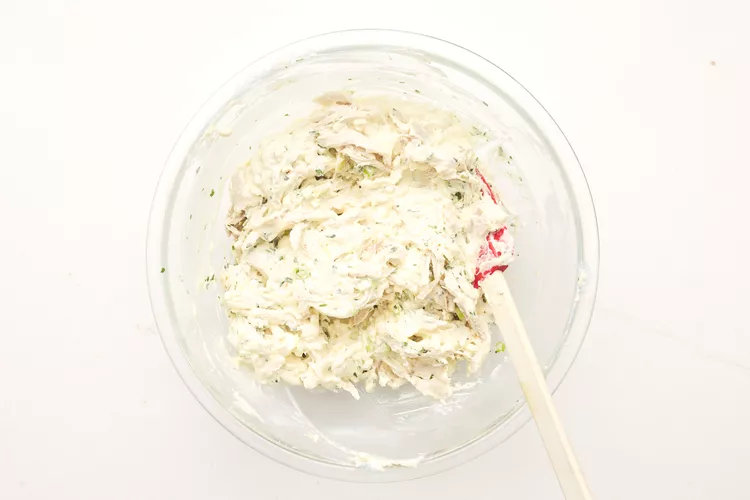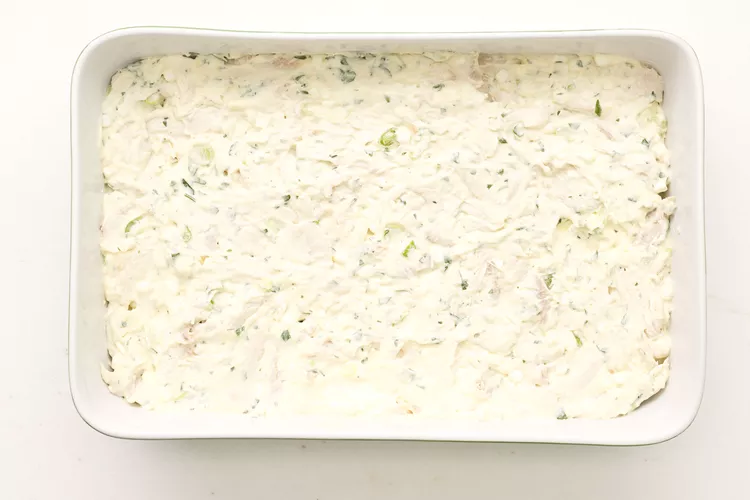 Preheat your oven to 350°F and lightly grease a baking dish. In a large bowl, add the softened cream cheese and stir until smooth, making sure there are no lumps before adding the remaining creamy ingredients.