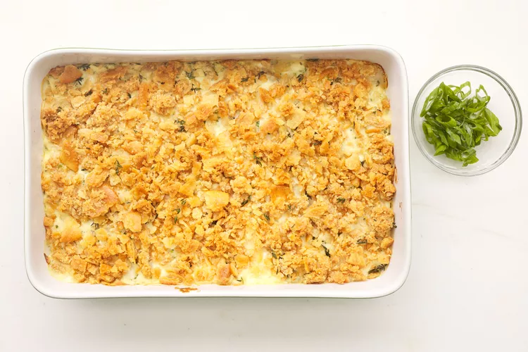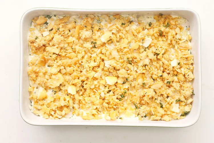 Sprinkle crushed crackers evenly over the top, then drizzle melted butter across the surface. Bake uncovered for about 35–40 minutes, until the top turns golden and the edges look bubbly and slightly crisp.