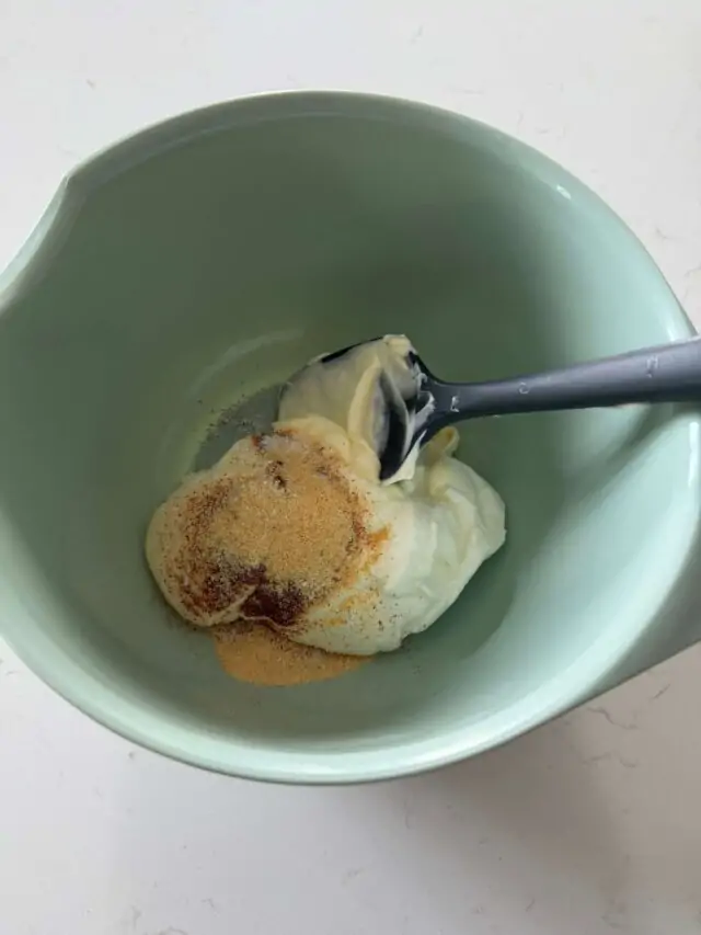 - In a bowl, mix sour cream, mayo, and spices