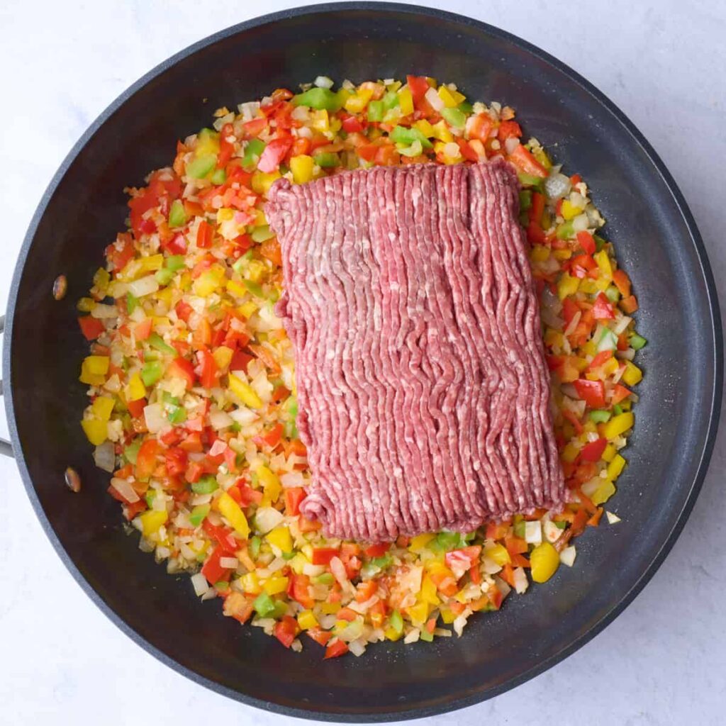 Heat olive oil in a pan over medium heat. Cook the diced onion until soft, then add garlic and stir briefly. Add the ground beef and cook until browned, breaking it apart so the texture stays even and crumbly.